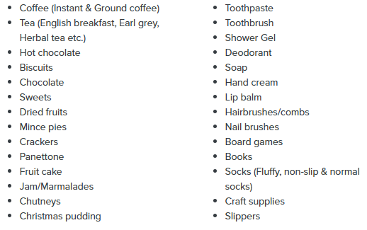 At this time of year, items such as mince pies and Christmas chocolates and biscuits are also very much appreciated.