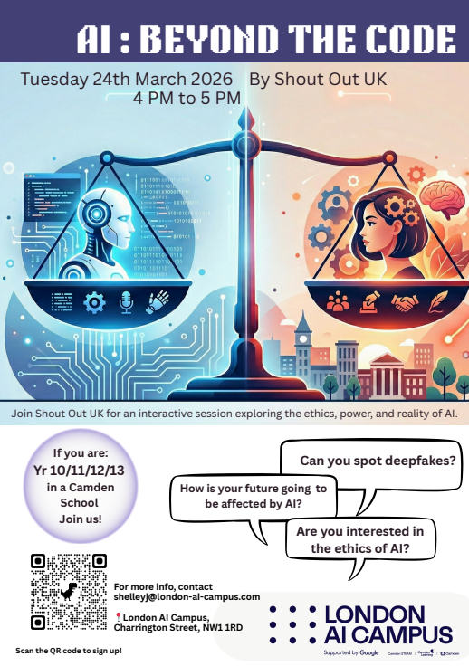 Shout Out UK, in partnership with the London AI Campus, is hosting an interactive session for students in Years 10 to 13 attending schools within the London Borough of Camden. This workshop moves beyond programming to explore the ethical and societal realities of Artificial Intelligence.